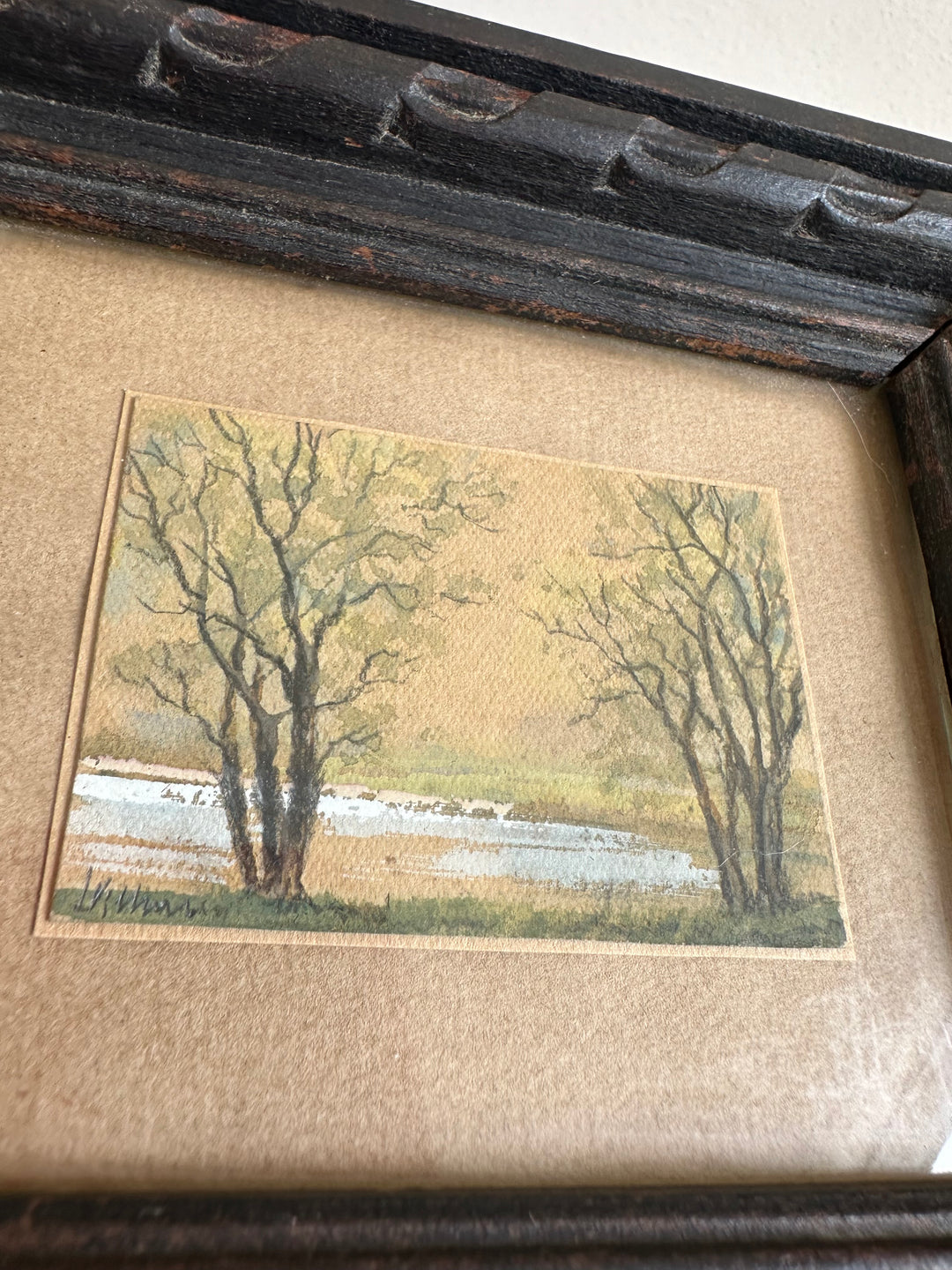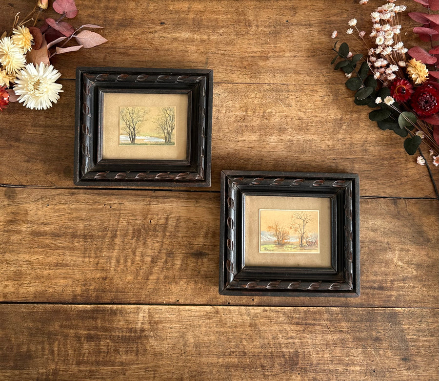 Charmant duo de délicats dessins encadrés. Cadres en bois foncé. Dessins signés. Estimation années 40. On aime l'atmosphère nostalgique qui s'en dégage. Vendus séparément