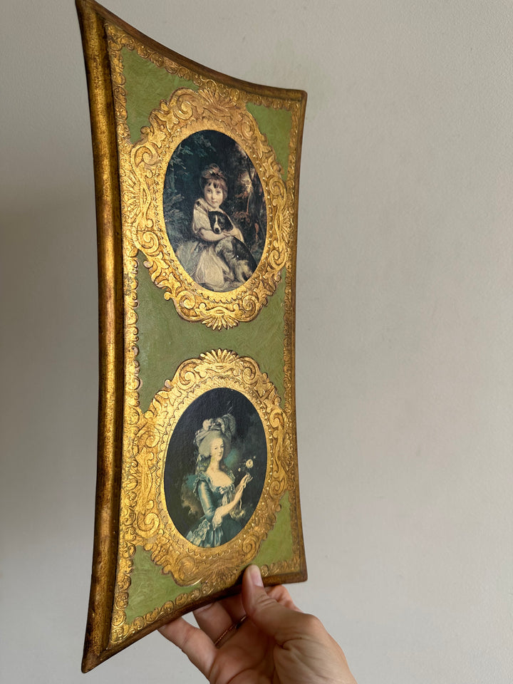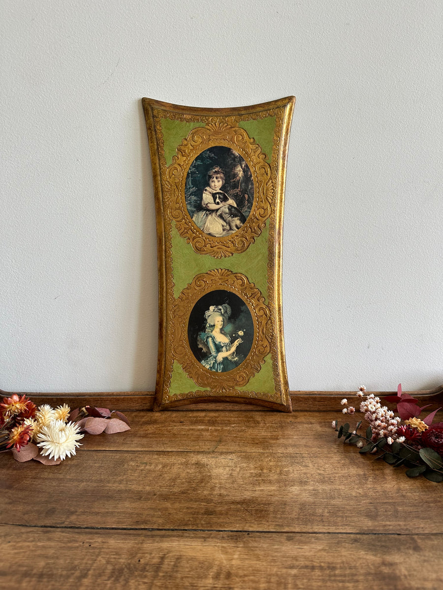 Joli diptyque d'impressions d'époque sur bois doré style florentin. Tons verts et or. Impressions de Madame de Pompadour et d'une petite fille et son chiot. Estimation années 50.