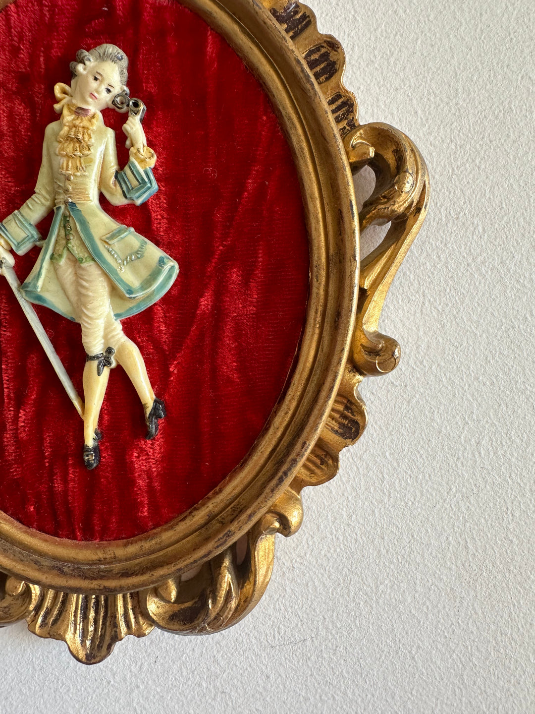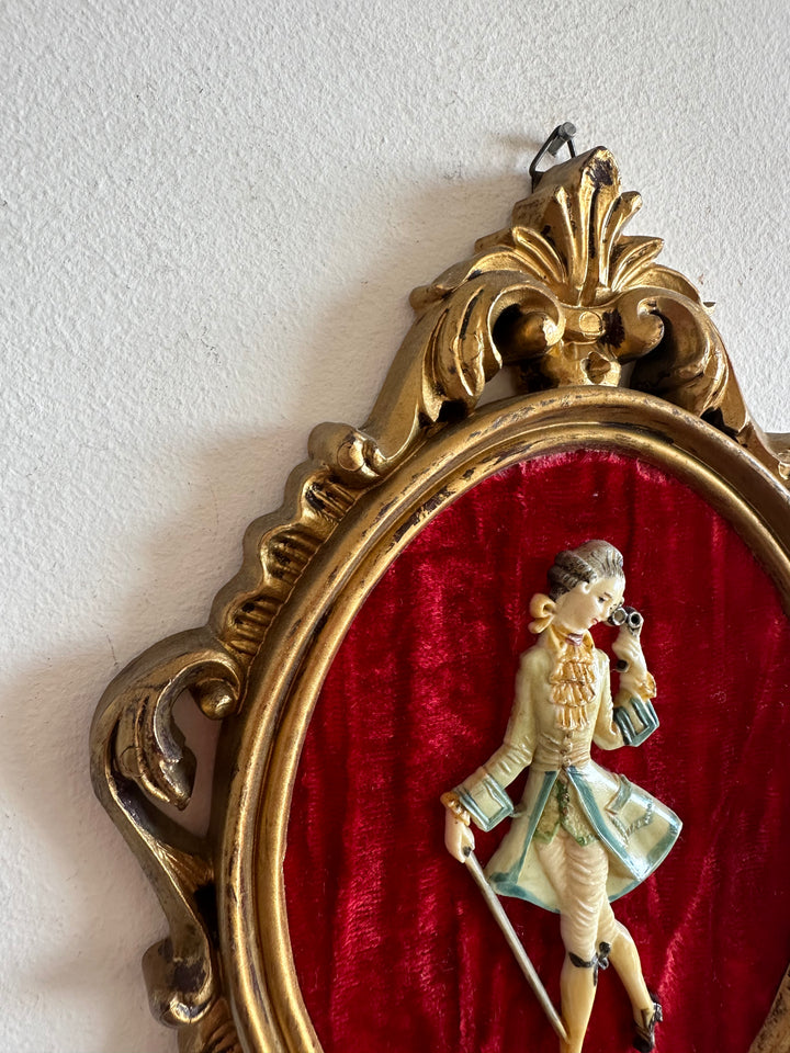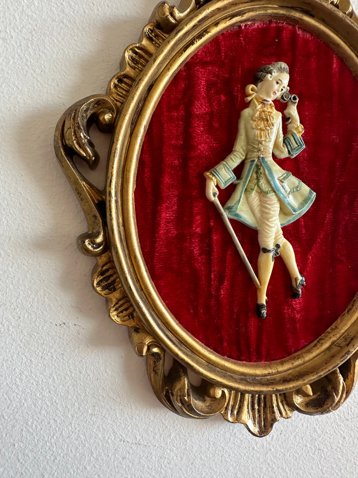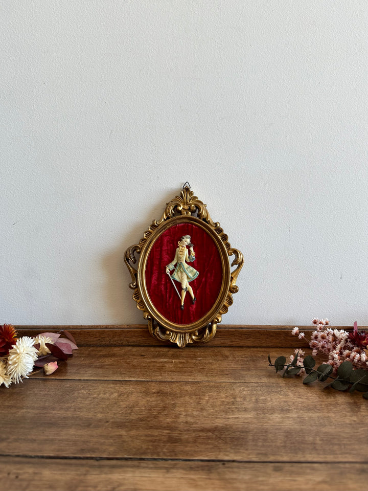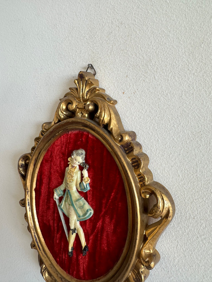 Adorable petite figurine en résine sur fond de velours rouge dans son cadre en plastique doré style rococo. Fabrication Italienne. Estimation années 60-70.