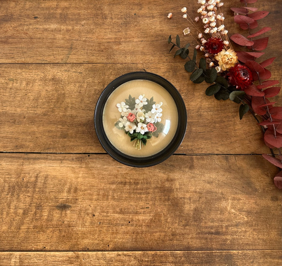 Joli petit bouquet de fleurs en tissu sous verre bombé dans son cadre en bois noir. Estimation années 60