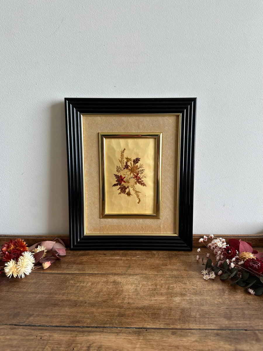 Ravissante composition florale séchée émaillée et encadrée. Estimation années 90.