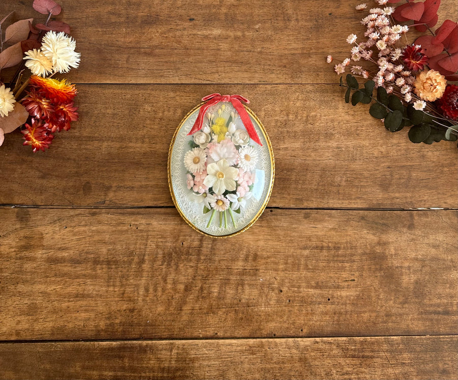 Ravissante petite composition de fleurs en tissu encadrée sous verre bombé. Estimation années 70.