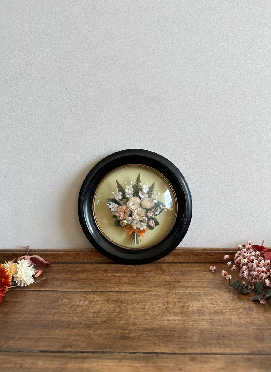 Fleurs séchées en tissu sous verre bombé rond dans cadre en bois noir