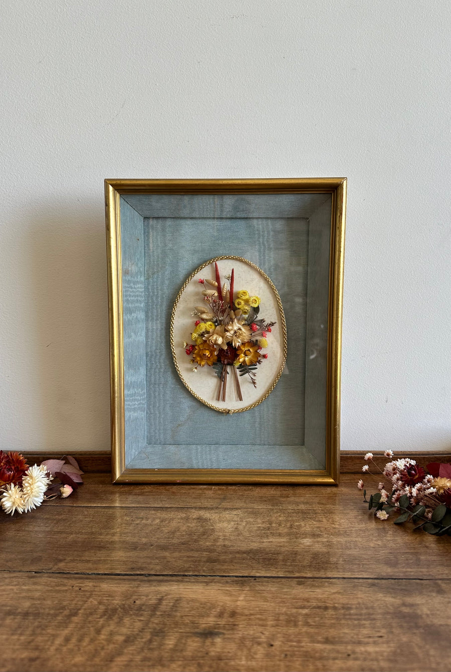 Adorable composition de fleurs séchées sur fond bleu. Cadre en bois doré rectangulaire sous verre. Estimation années 60. De discrètes traces du temps visibles sur les photos.