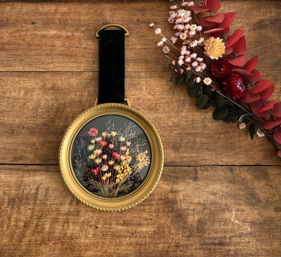Joli bouquet de fleurs séchées sous un verre bombé, avec une attache en velours noir. Cadre en plastique doré. Estimation années 60. À noter, de légères traces d'usure au niveau du velours.