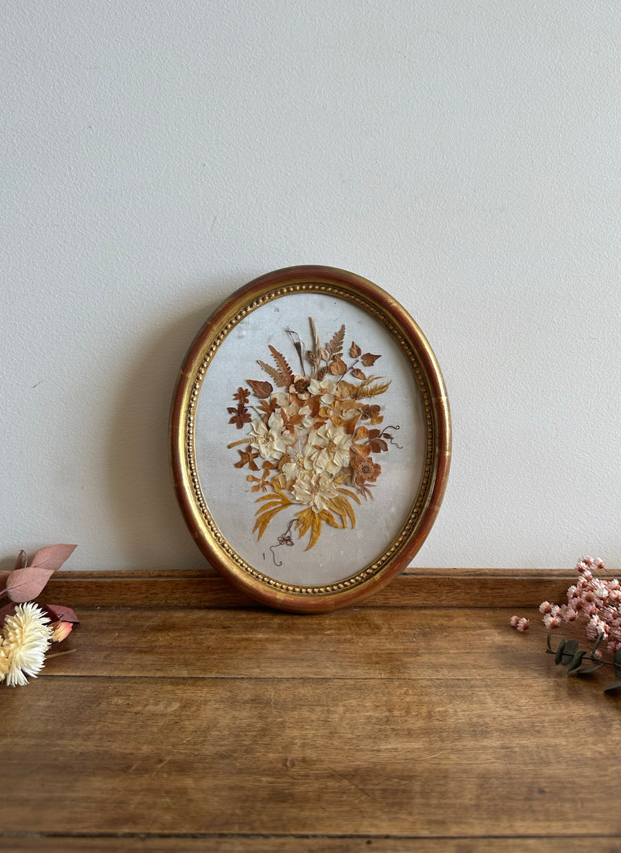 Délicate composition de fleurs automnales séchées sur un tissu blanc satiné. Pressées sous verres dans leur joli cadre doré. Estimation années 40. Objet présentant des traces du temps.