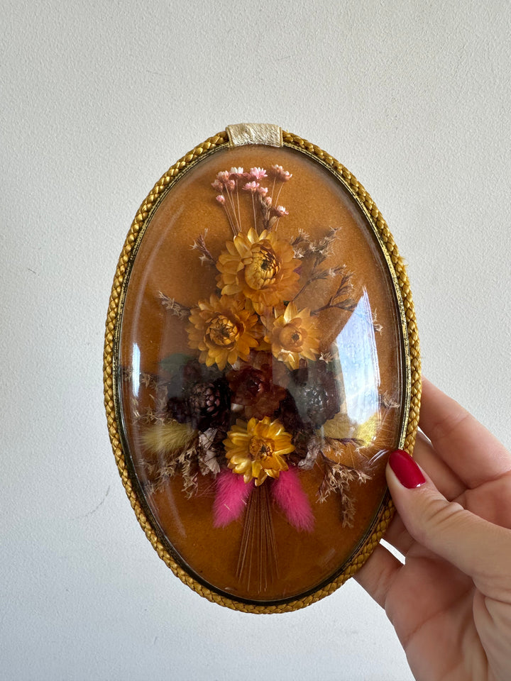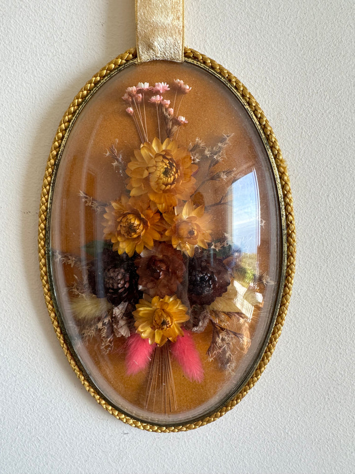 Adorable composition florale sur fond en velours moutarde. Fleurs séchées sous verre bombé cerclé d'un galon moutarde. Accroche ruban. Estimation années 60-70.