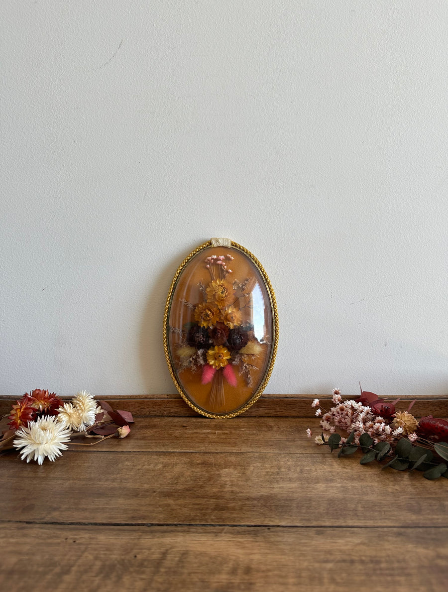 Fleurs séchées sur fond velours moutarde sous verre bombé
