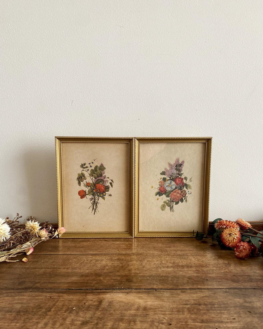 Jolies petites gravures florales dans leur cadre doré rectangulaire