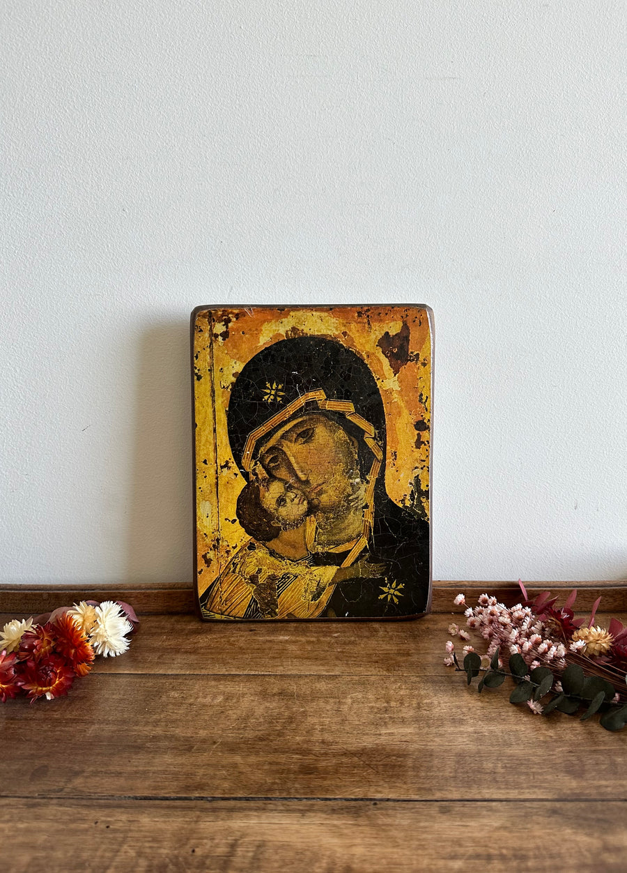 Belle icône orthodoxe de La Mère de Dieu, également connue sous le nom de Notre Dame de Vladimir, ou Vladimirskaia, sur bois épais. Estimation années 70.