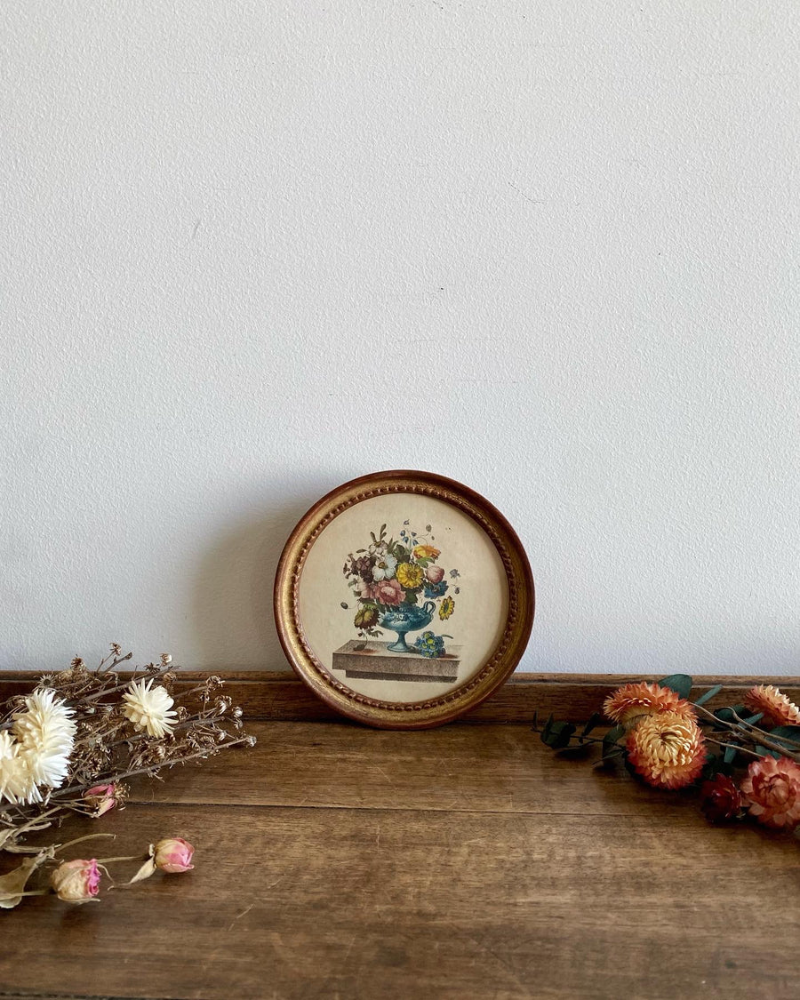 Ravissant petit médaillon en bois doré perlé avec sa jolie illustration printanière.