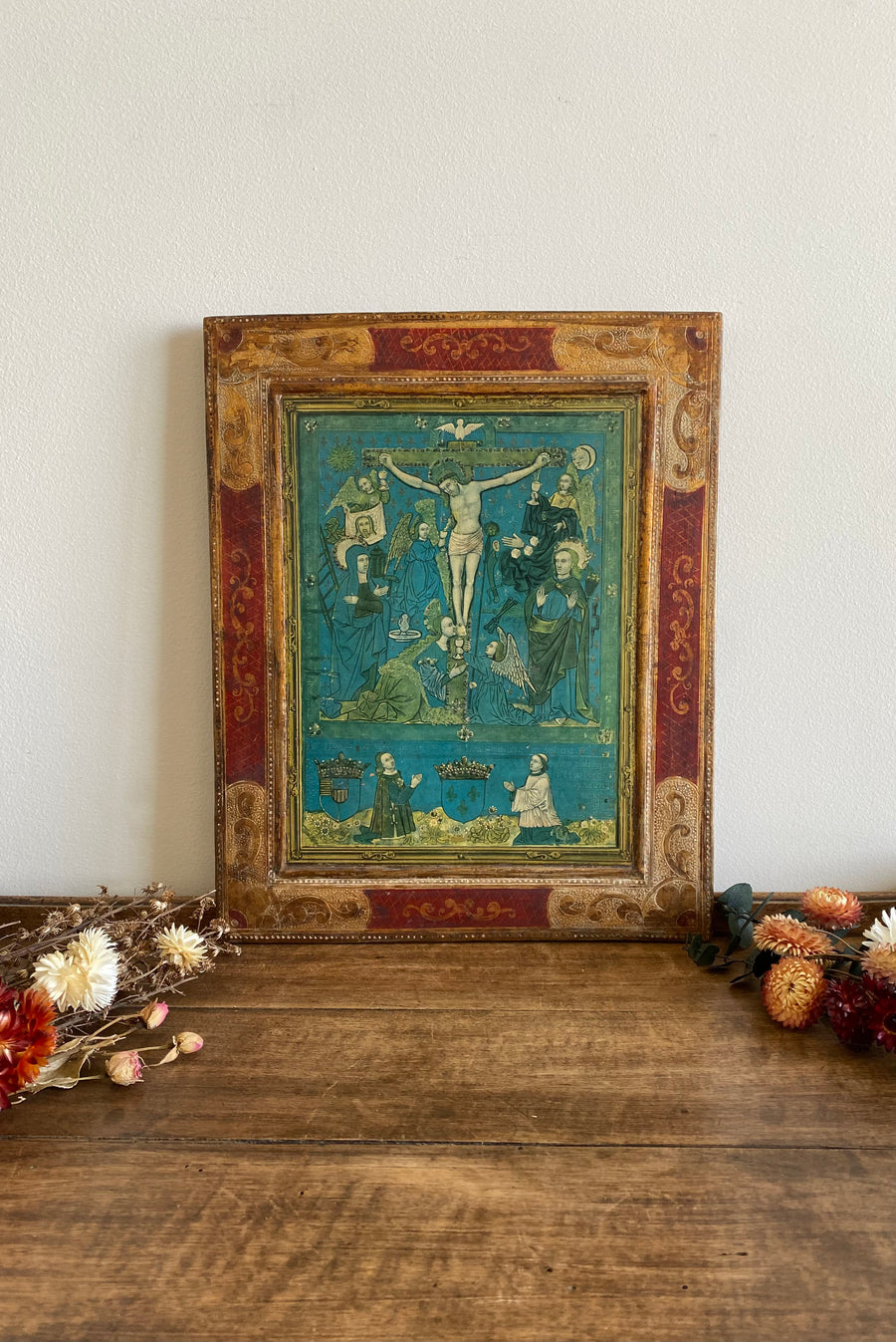 Illustration icone sur bois vernis religieux encadré de rouge et or style florentin