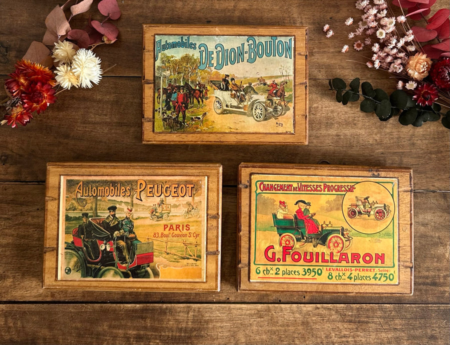 Charmant trio d'images publicitaires collées sur bois. Estimation années 60. Vendues séparément.