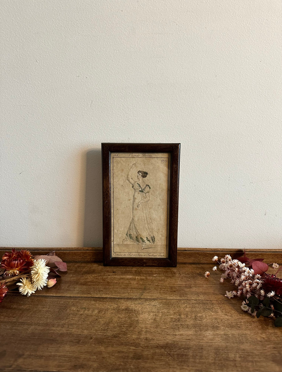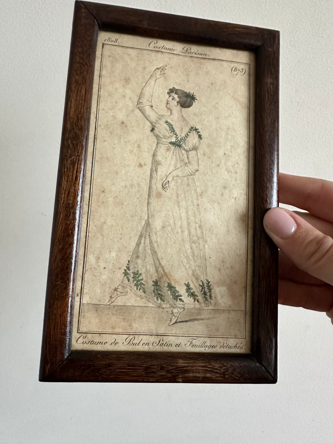 Belle impression datant de 1808, illustrant un costume parisien. Costume de Bal en Satin et Feuillages détachées. Cadre en bois à accrocher.