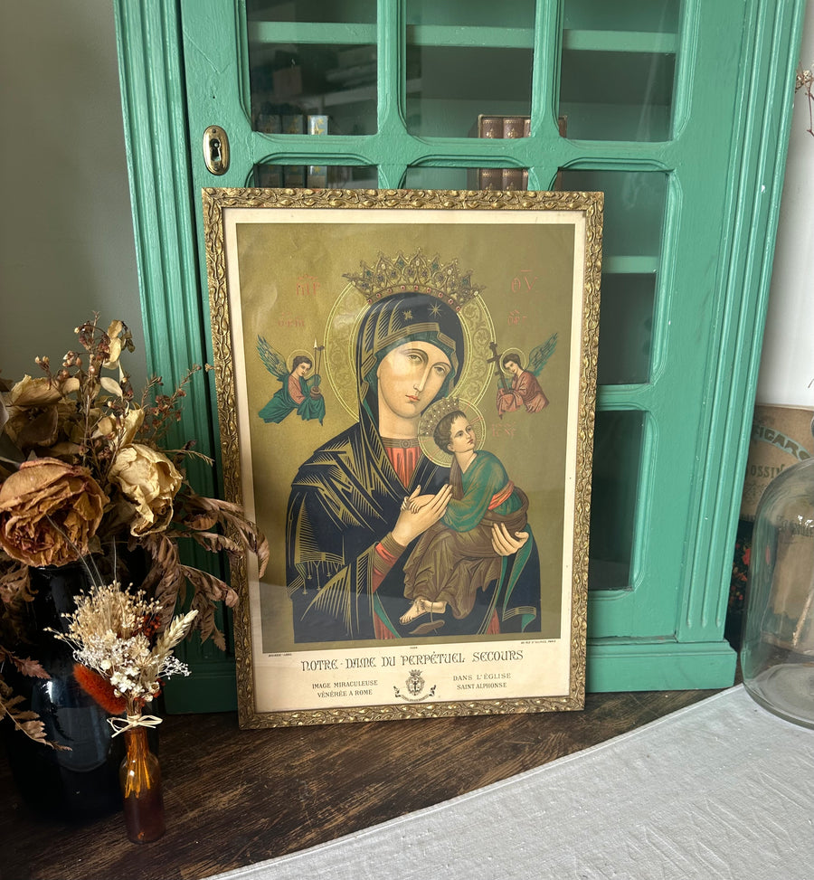 Belle impression représentant Notre Dame du Perpétuel Secours. Estimation années 50. A noter de légers manques discrets au niveau du cadre, signalés sur les photos.