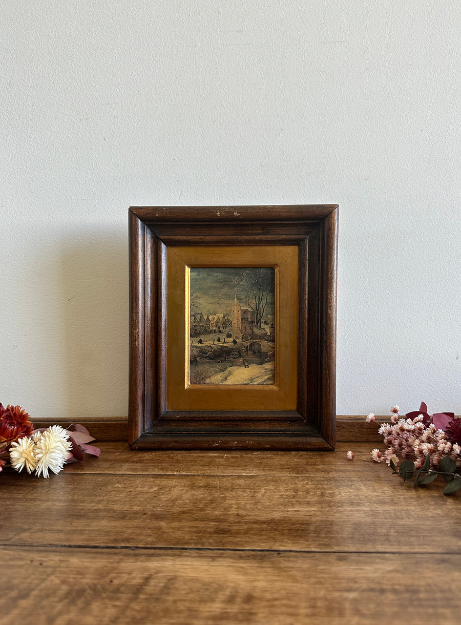 Charmante petite impression encadrée représentant une scène d'hiver avec patineurs sur glace. Estimation années 80.