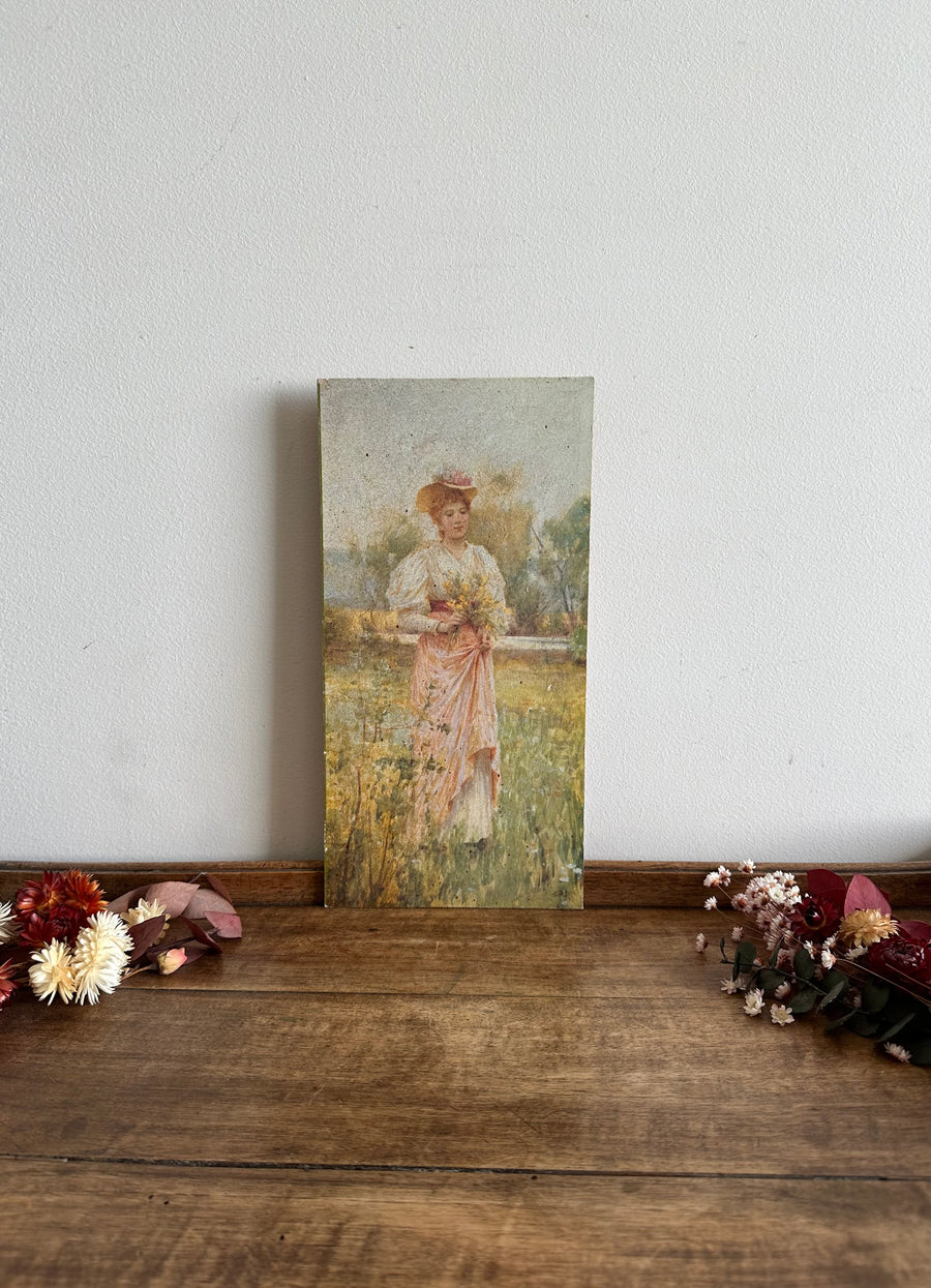 Coup de coeur pour cette jolie impression sur planche d'après l'oeuvre d'Alfred Glendening, peintre Anglais de l'époque Victorienne (1861, 1907). Representation d'une jeune femme en tenue printanière, tenant un joli bouquet de fleurs. Estimation années 60-70, dans l'ésperit Napoléon III.