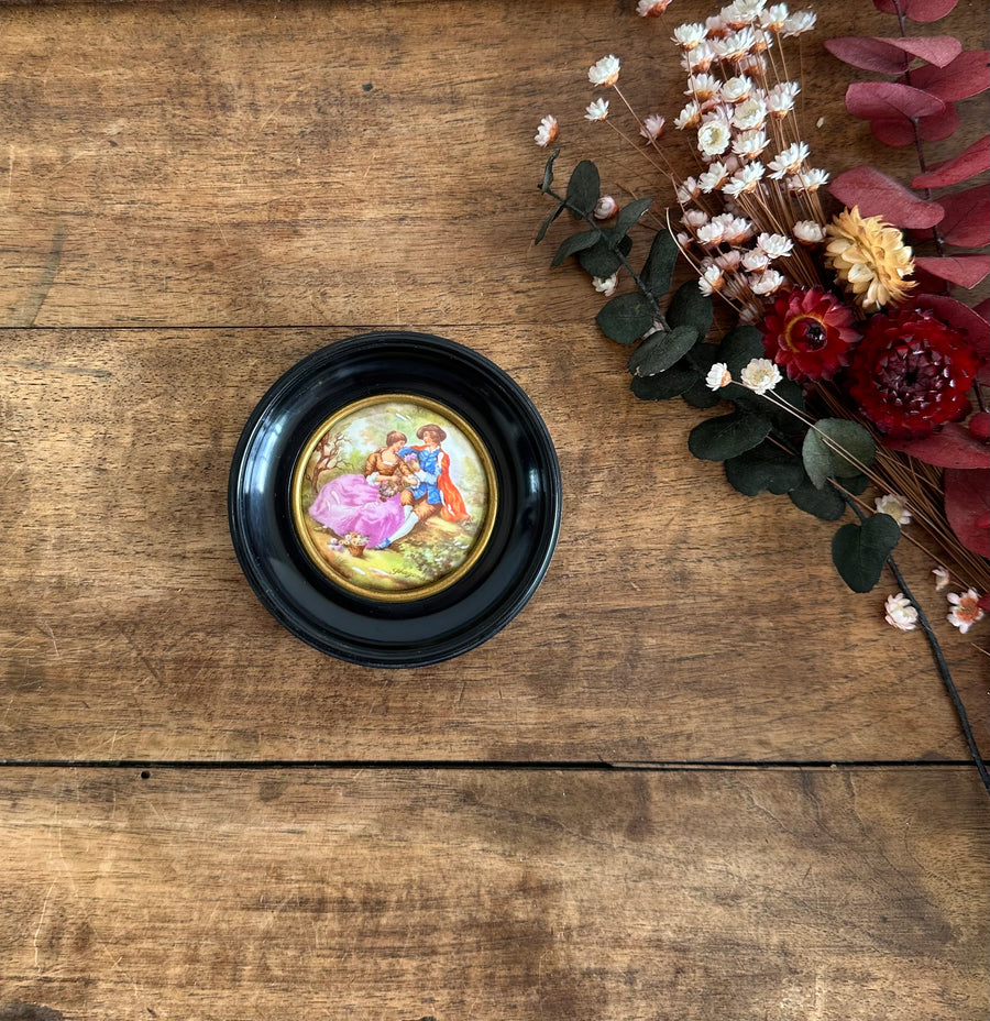 Ravissante petite impression sur porcelaine de Limoges. Scène d'époque d'après Fragonard. Estimation années 70-80. Cadre rond en plastique noir .