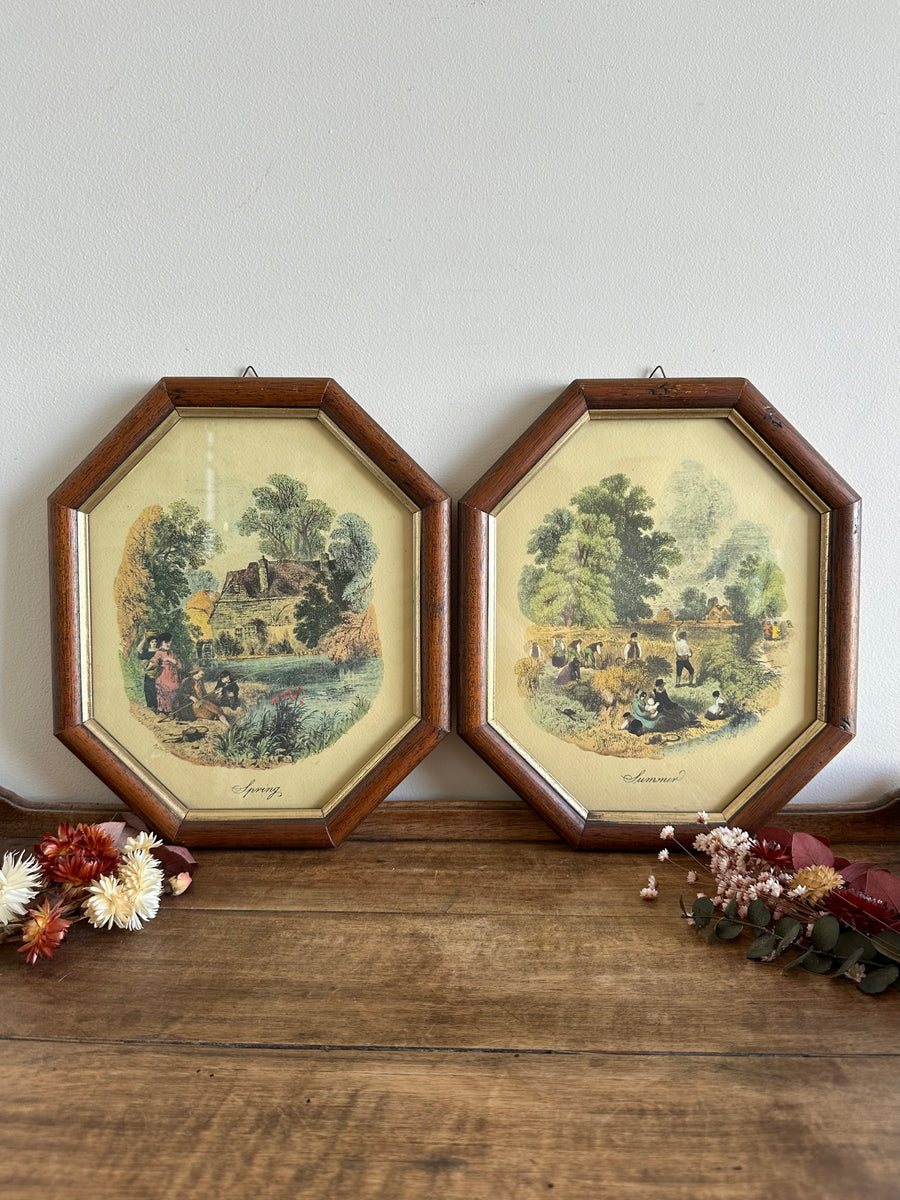 Charmantes petites impressions dans leurs cadres en bois. Estimation années 70. Vendues séparément. Summer & Spring.