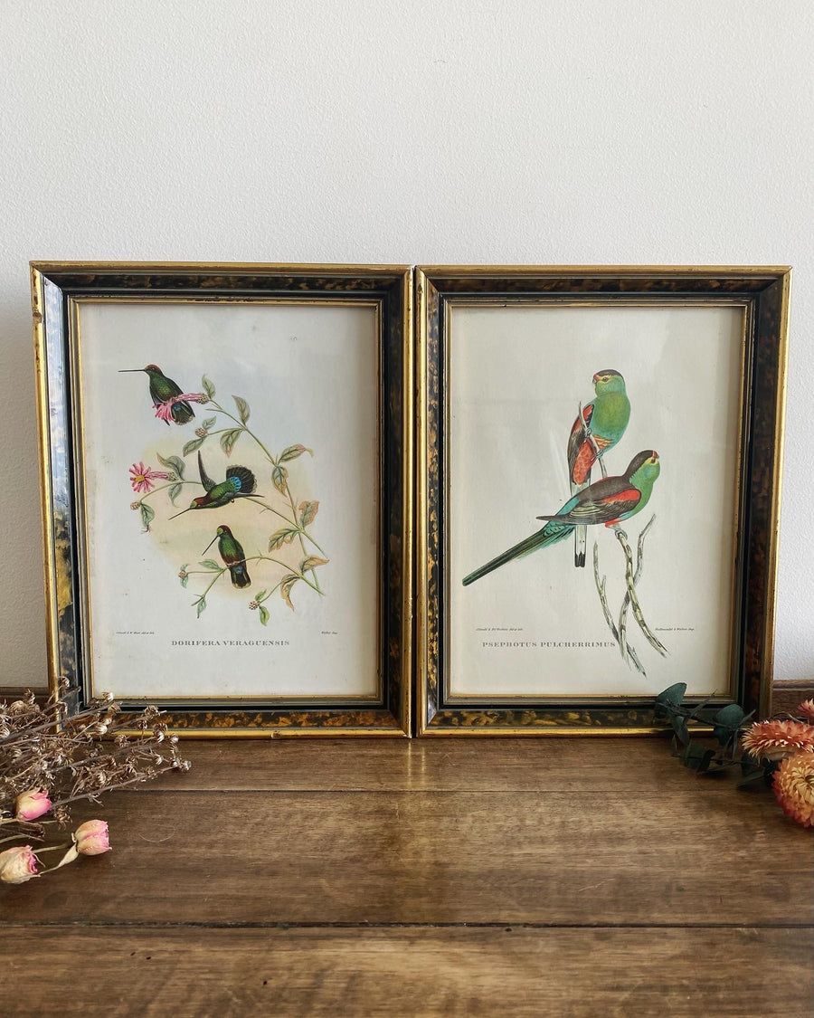 Lot de deux impressions vintage : l'une nommée "Psephotus Pulcherrimus" de Gould & Richter représentant deux perruches de paradis, l'autre nommée "Dorifera Veraguensis" de Gould & Hart représentant deux colibris, dans leurs cadres dorés mouchetés d'origine.