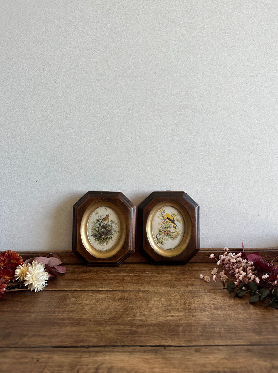 Joli duo d'impressions encadrées représentant des oiseaux et leurs nids. Estimation années 50. Vendus séparément.