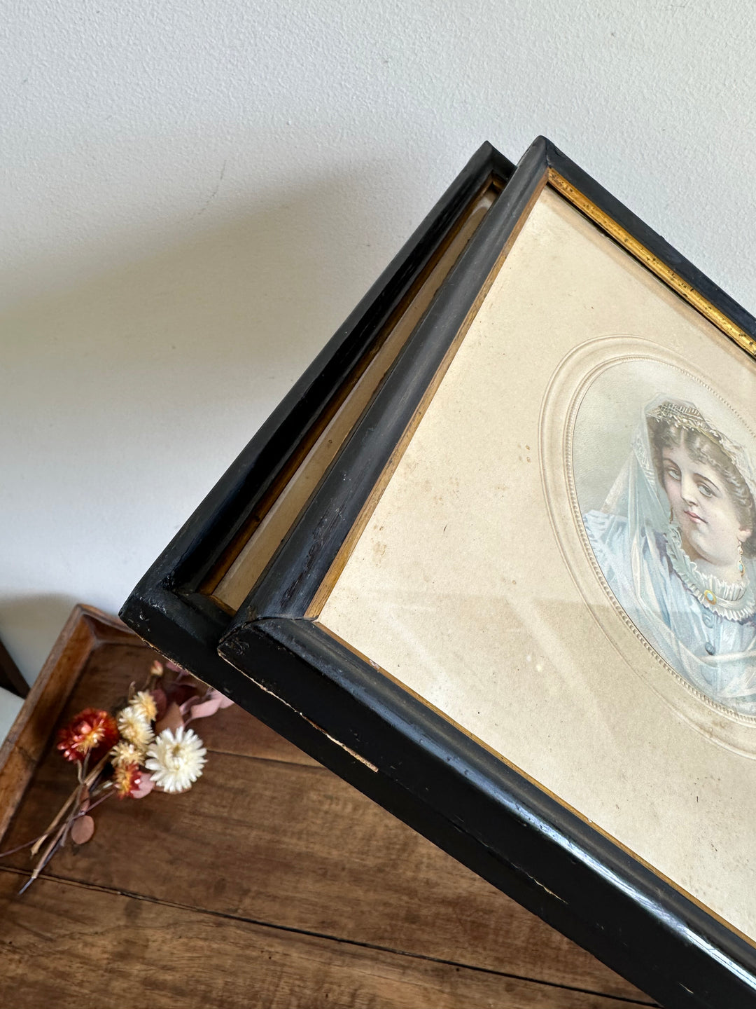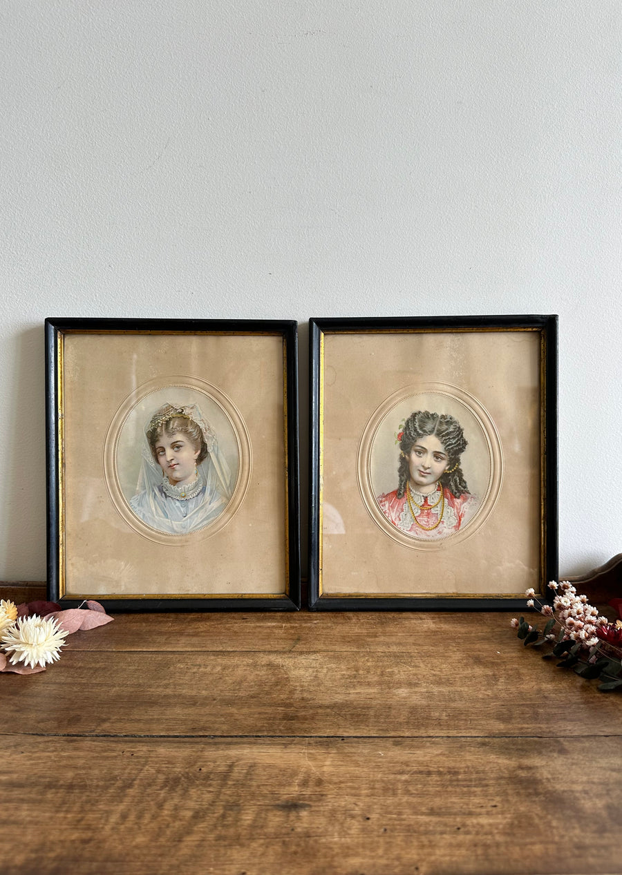 Charmants portraits de jeunes filles en tenues d'époque. Impressions encadrées. Cadre en bois noir liseret doré. Estimation années 1900. Vendus séparement. De jolies traces du temps au niveau du cadre dûes à leur grand âge.