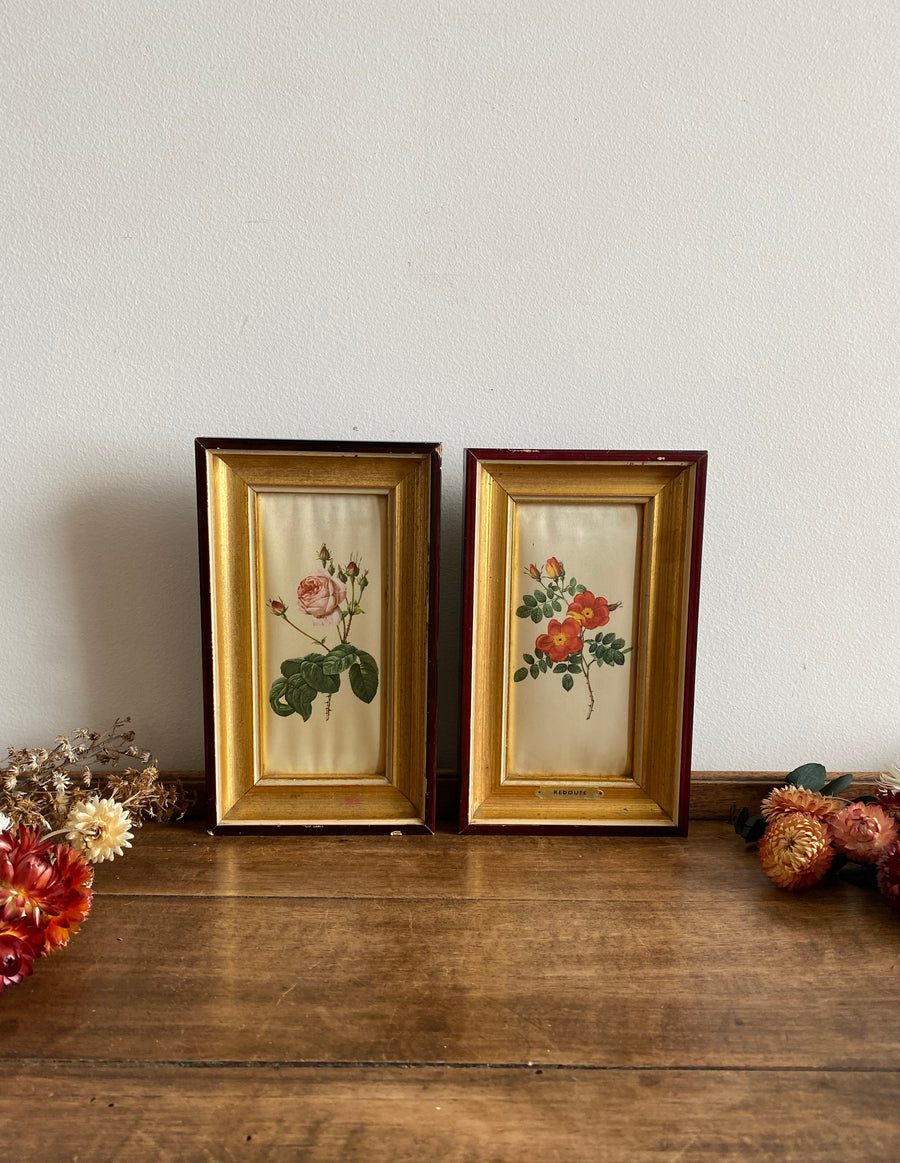 Lot de deux jolies impressions sur soie Redouté dans leurs cadres rectangulaires dorés. Vendus séparément.