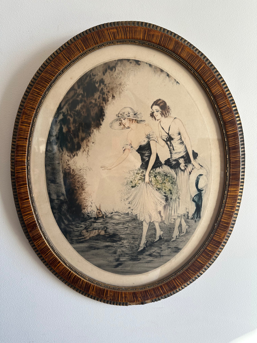 Superbe lithographie signée O André, par les lithographes Hautecoeur Frères & co Paris. Art boudoir des années folles, dans le goût de Louis Icart et Jean Hardy. On aime particulièrement la finesse des sujets et leurs jolies toilettes. Estimation années 1924. A noter, des petits manques au niveau du cadre (photos)