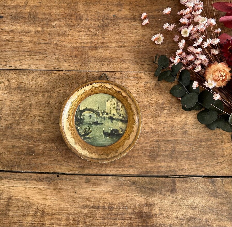 Jolie petite image de Venise dans son cadre en bois rond style florentin. Estimation années 50