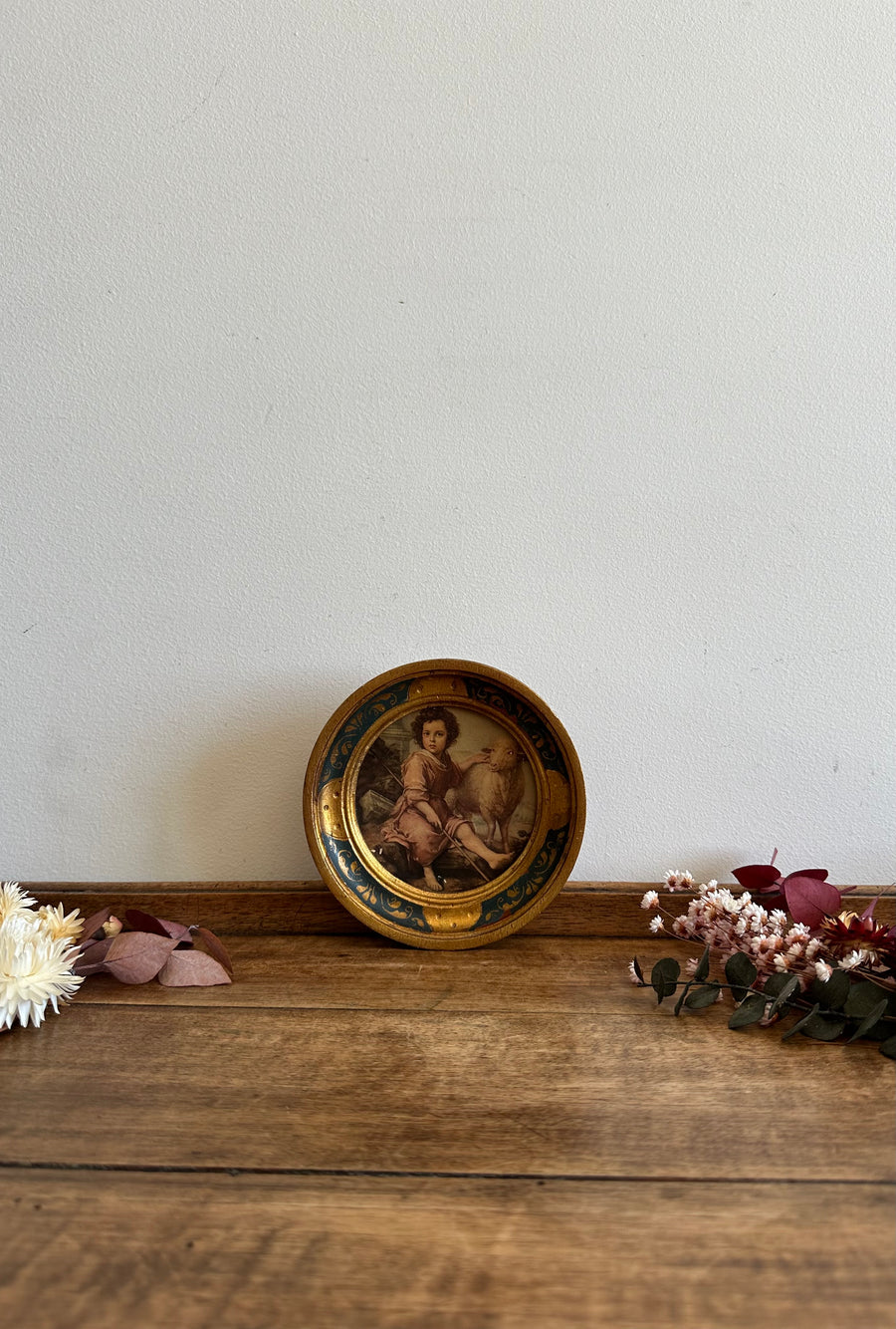 Charmante représentation de l'oeuvre de Murillo Le Bon Pasteur dans son cadre en bois rond style florentin tons bleus et or. Estimation annérs 50. Impression encadrée.