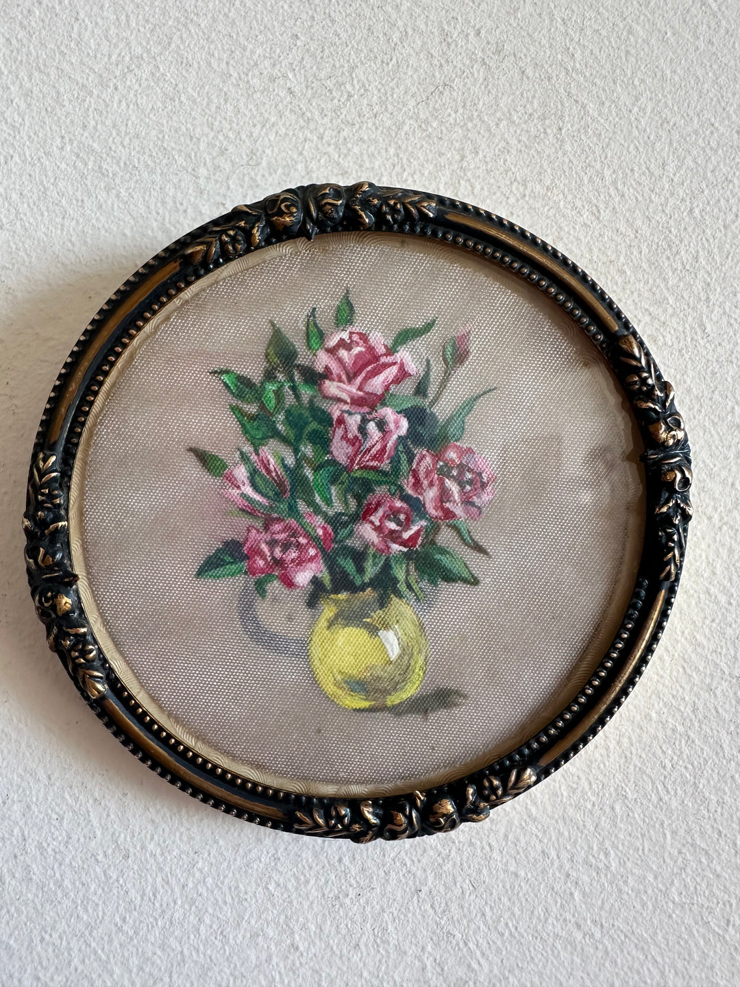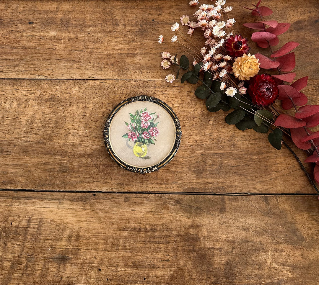 Ravissant médaillon rond en laiton sous verre, à accrocher. Décoration florale peinte sur tissu. Estimation années 60.
