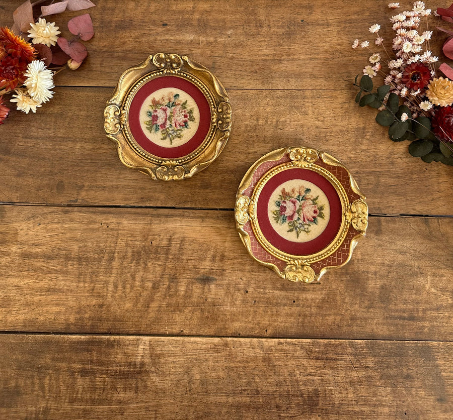 Adorable duo de petites broderies dans leurs médaillons en bois doré. Estimation années 50. Vendus séparément.