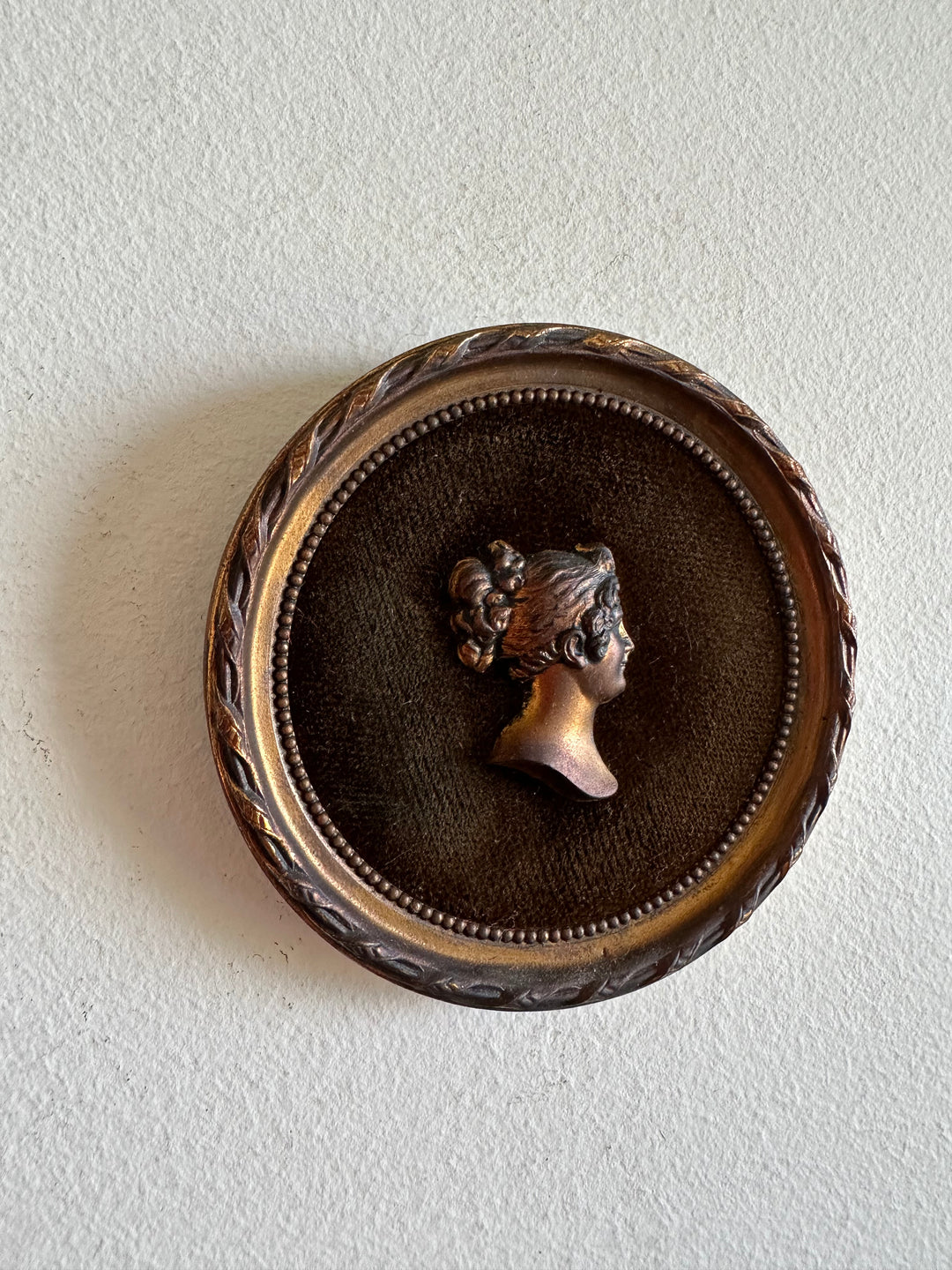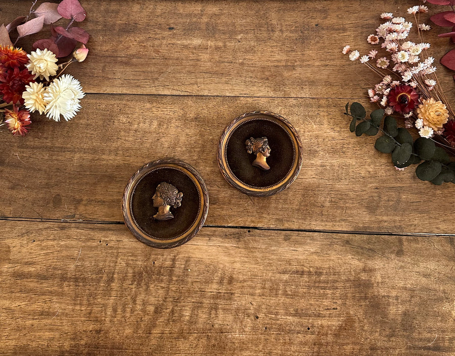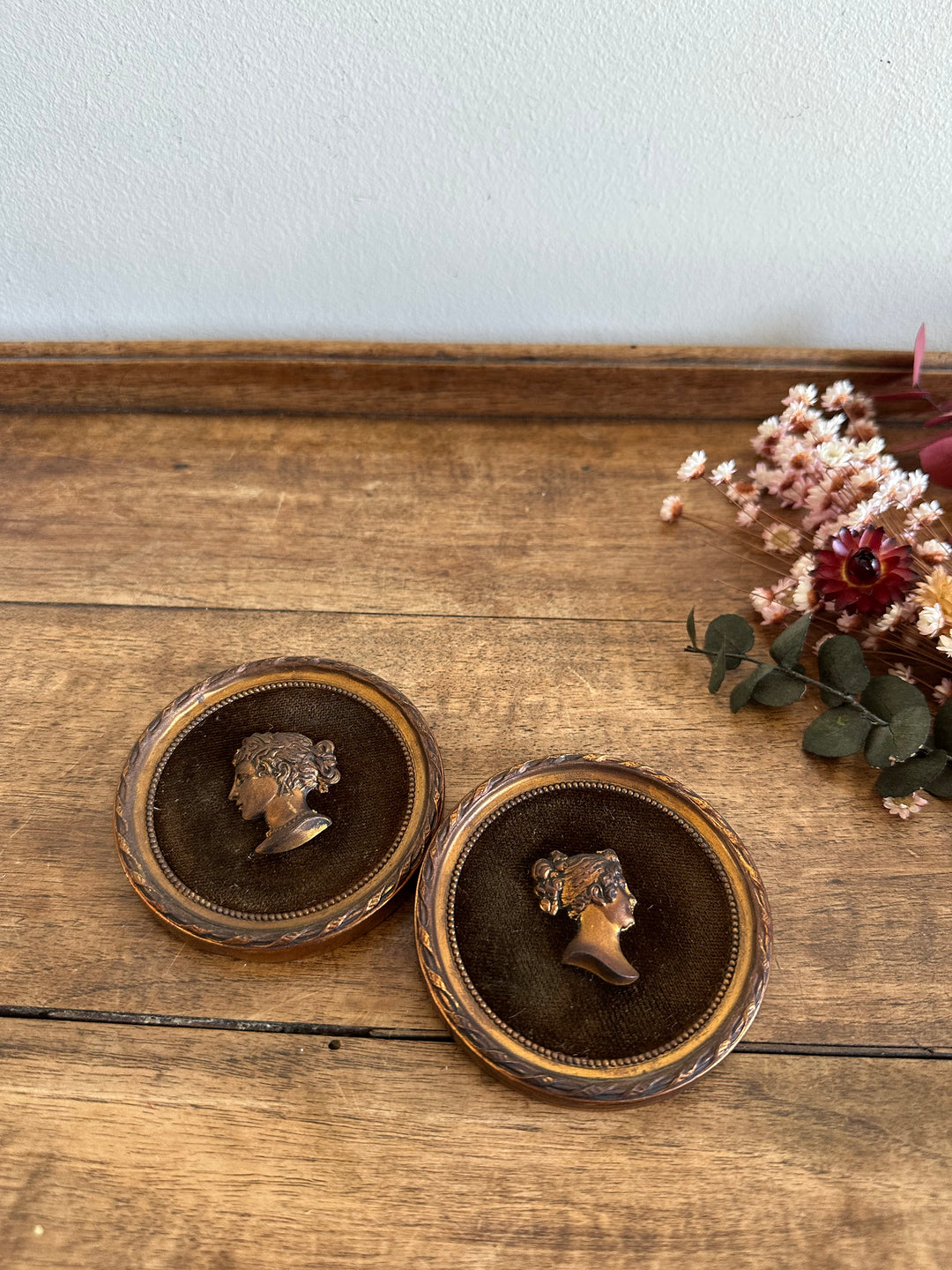 Adorable duo de petits médaillons en métal effet bronze doré. Vendus séparément.