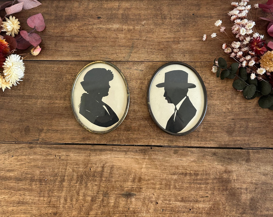 Adorable duo de petites silhouettes en papier découpé sous verre bombé. Vendues séparément. Estimation début XX ème; A noter, ne disposent pas d'attaches murales mais vous pourrez facilement les ajouter selon vos besoins.