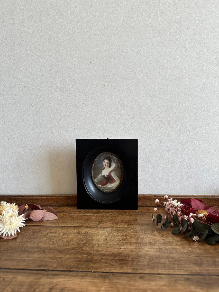 Adorable petite miniature d'après l’Etude de Fragonard. Impression rehaussée à la main. Estimation années 60.