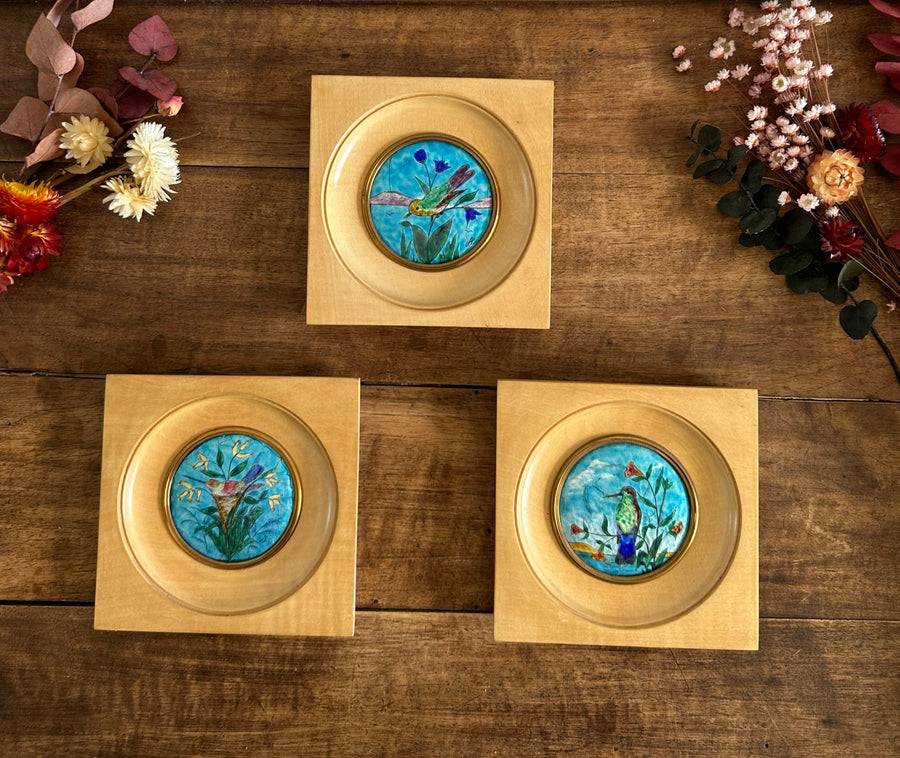 Lot de trois adorables miniatures émaillées dans leurs cadres carrés en bois clair .Il s'agit de pièces uniques. Cerclées de laiton.