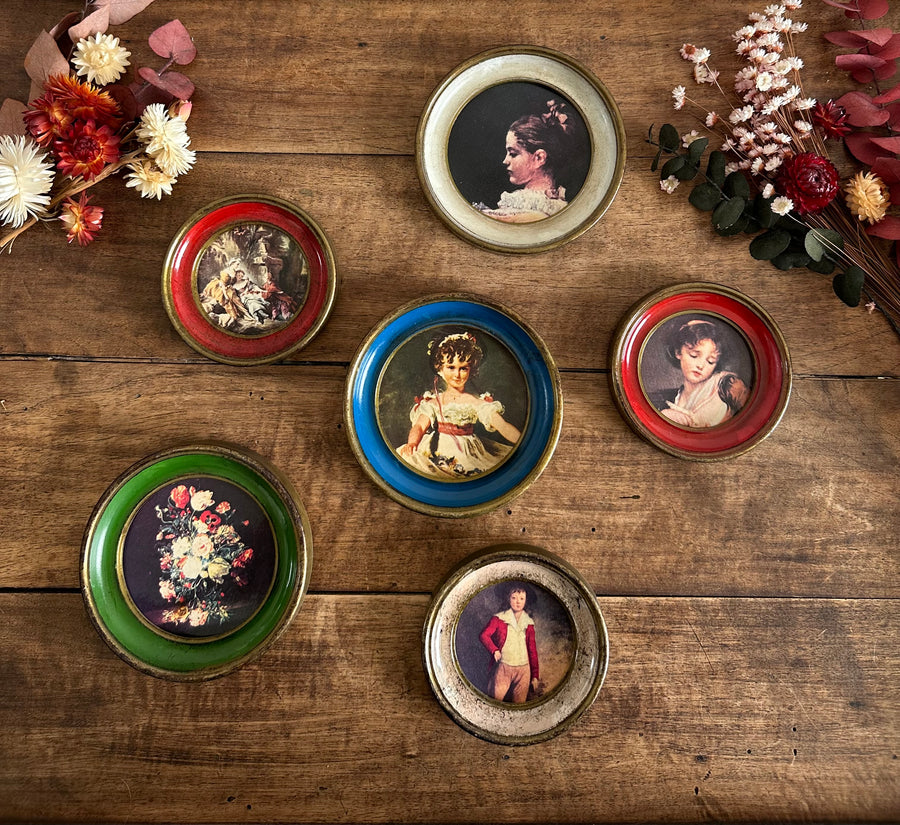 Adorable lot de petits médaillons ronds. Représentations imprimées d'oeuvres classiques. Médaillons en plastique. Fabrication Italienne. Estimation années 70-80. Vendus à l'unité.