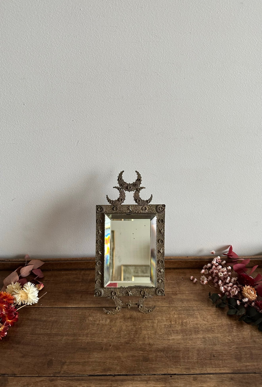 Beau miroir biseauté à poser. Estimation début XXème. Origine moyen-orient. Pourra également être accroché au mur en ajoutant l'accroche adéquate. Des traces du temps et des imperfections visibles sur les photos.