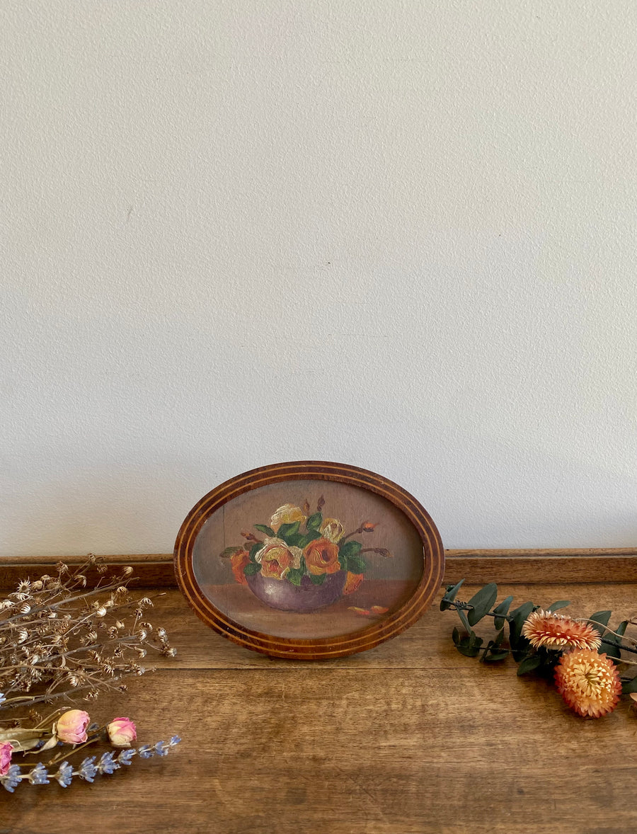 Jolie nature morte peinte sur bois vintage dans son cadre en bois ovale