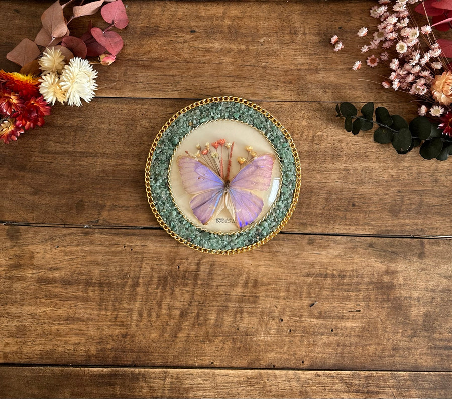 Joli papillon sous verre bombé dans son cadre cerclé de petites pierres. Années 90. Taxidermie souvenir du Brésil.