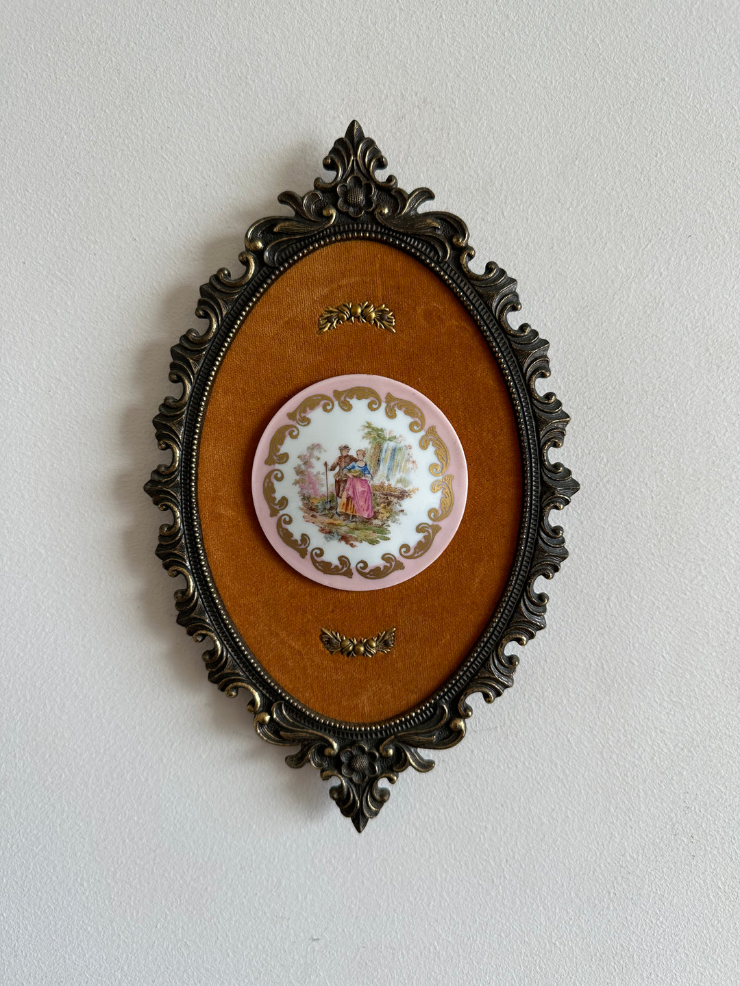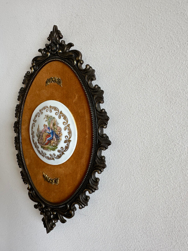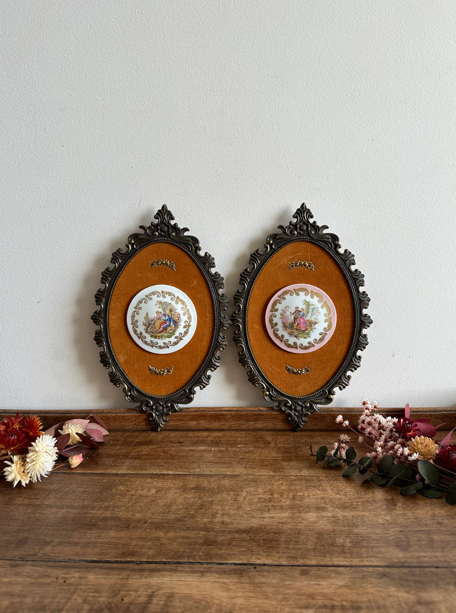 Ravissant duo de scènes d'époque sur porcelaine. Jolis médaillons sur fond de velours orangé cerclés de métal doré style rococo. Fabrication italienne. Estimation années 80.