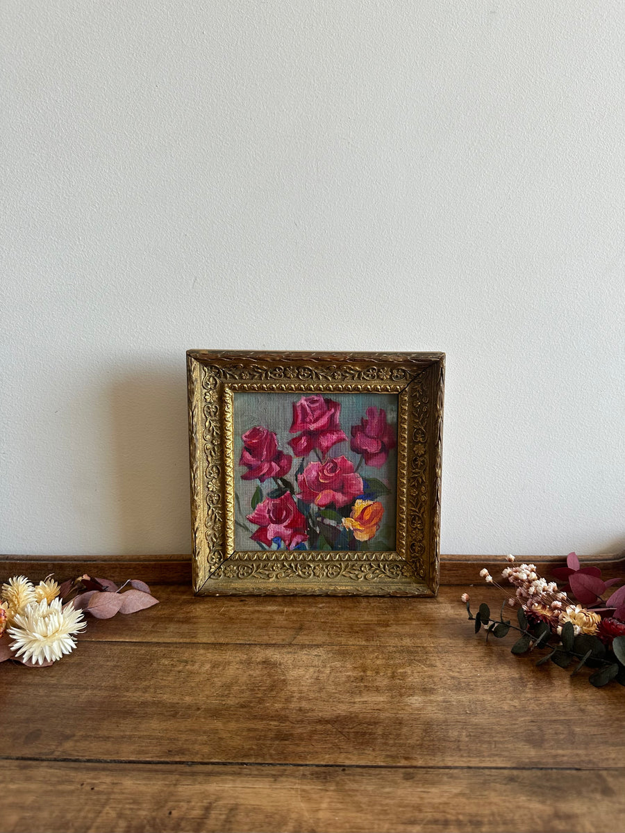 Peinture à l'huile roses sur fond gris cadre napoléon III
