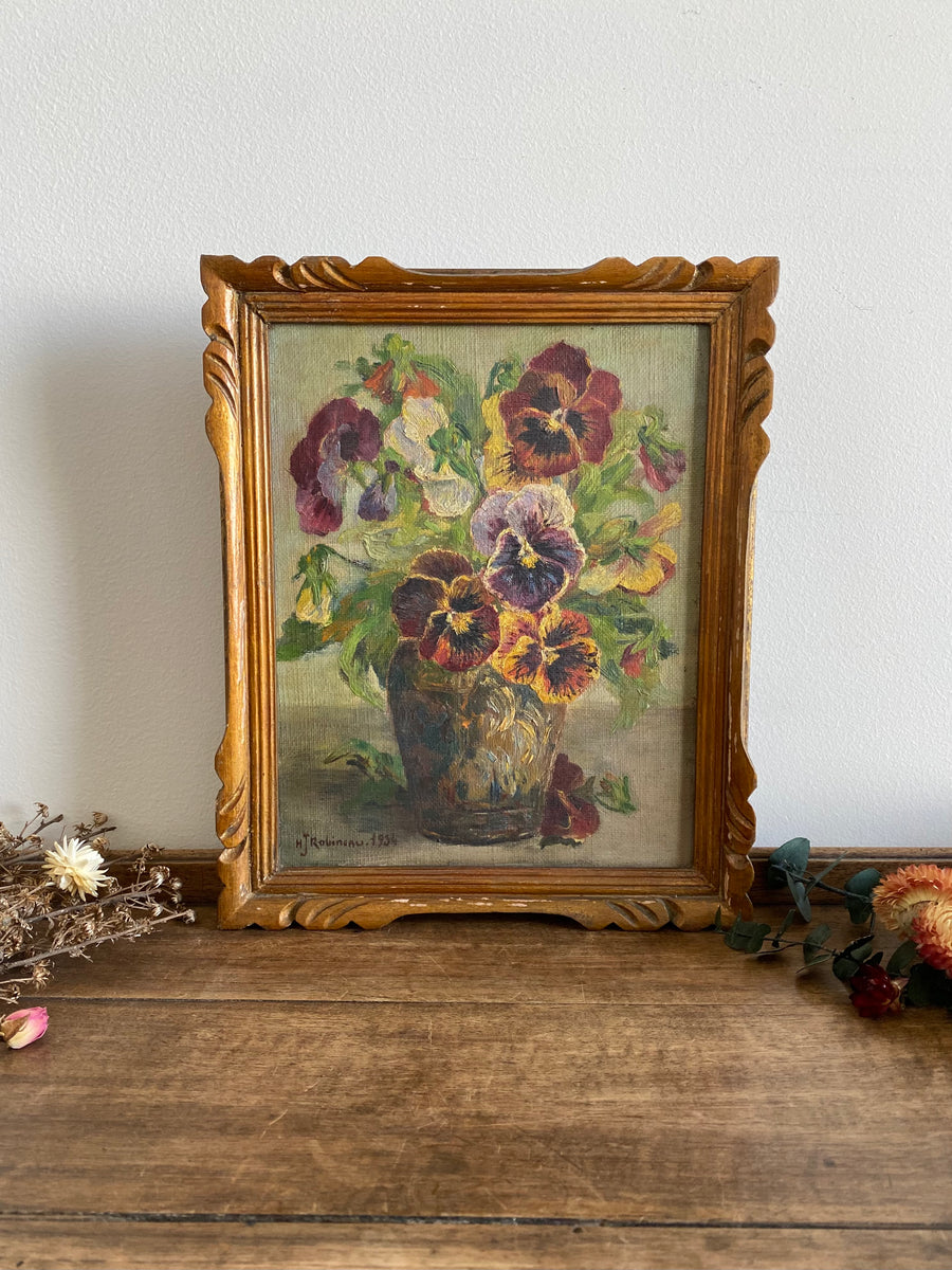 Tableau ancien - peinture à l'huile sur toile représentant un charmant bouquet de fleurs aux tons violets et jaunes dans son joli cadre mordoré.