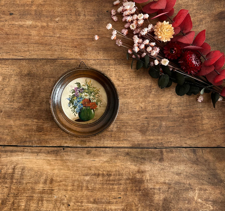 Peinture bouquet de fleurs dans petit médaillon en bois ébène