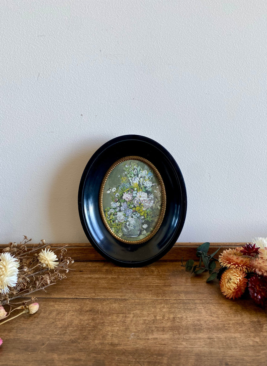 Adorable petite représentation florale sur fond vert, dans son joli cadre ovale noir en plastique.