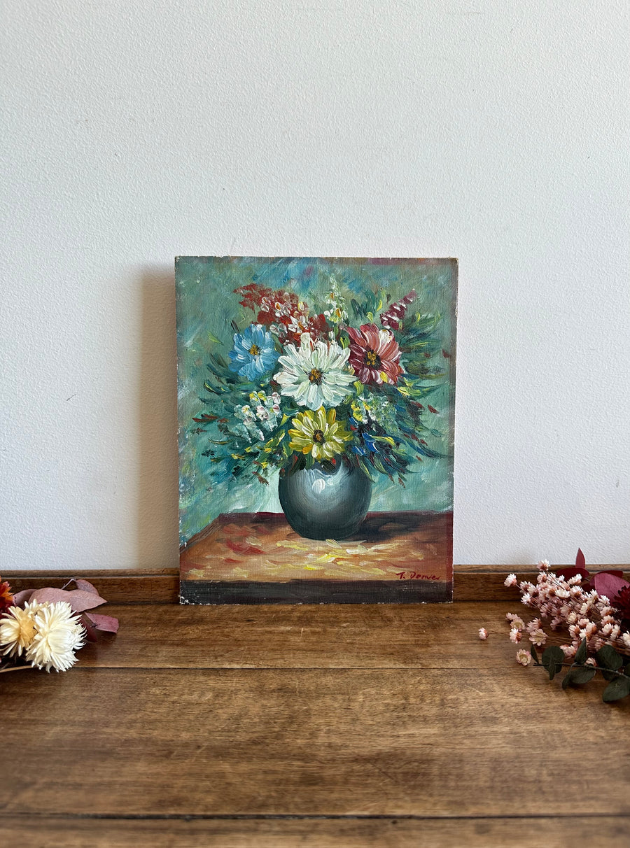 Adorable peinture sur toile représentant un bouquet de fleur sur un beau fond bleu. On aime la gaieté et la fraicheur qui en émanent. Signée T. Denver Estimation années 60-07