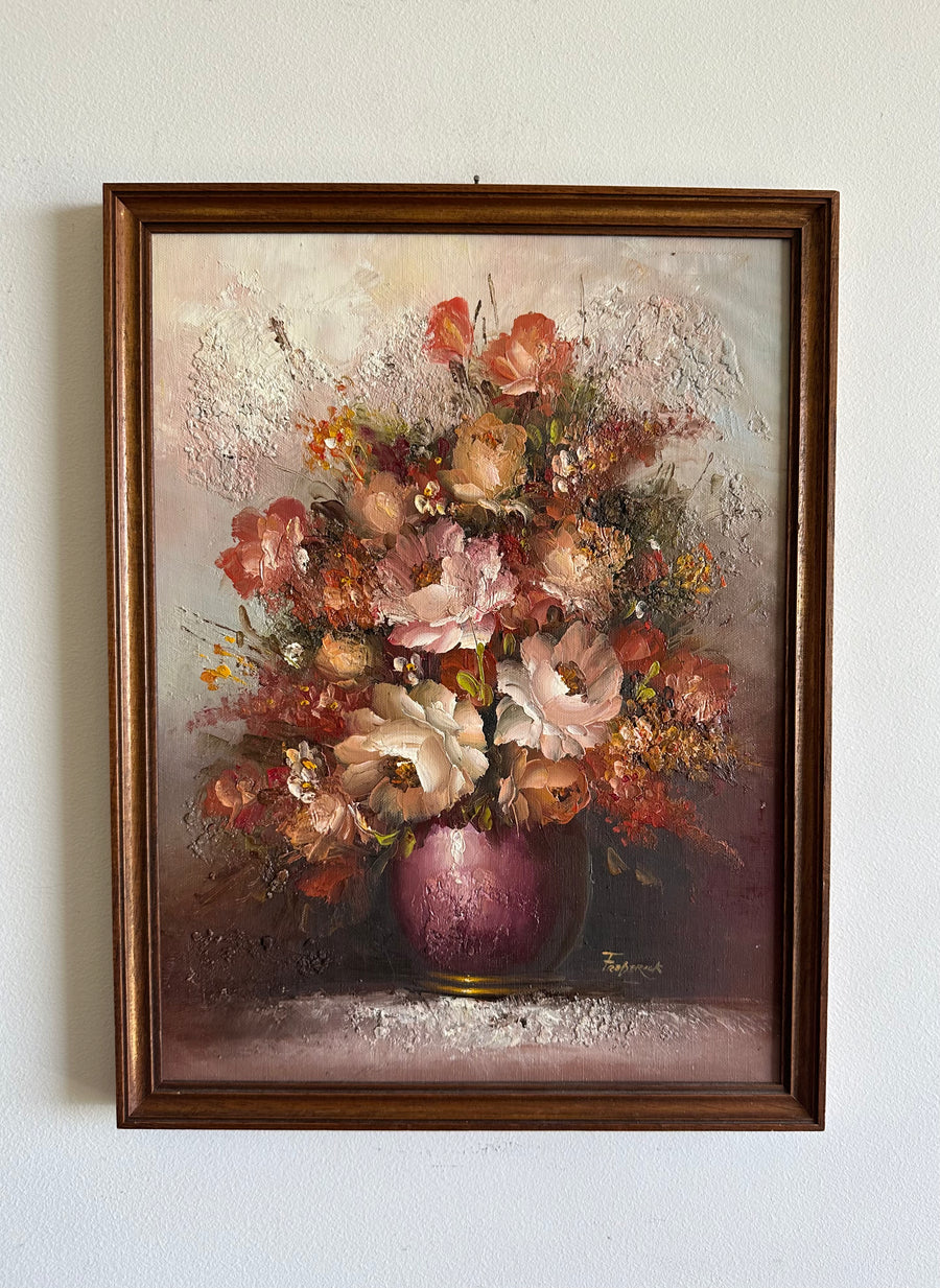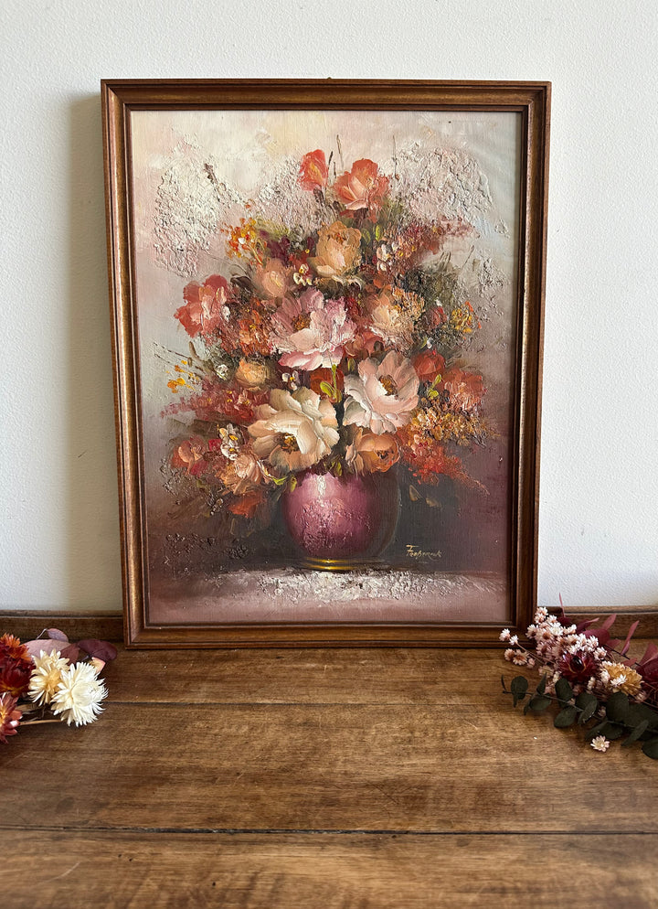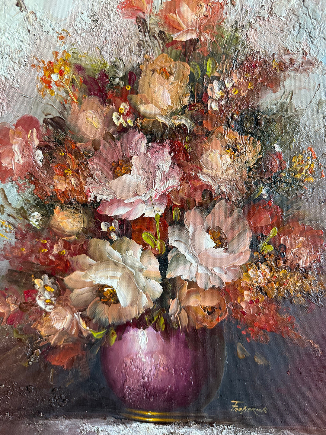 Belle peinture signée Frederick représentant un bouquet de fleurs. Encadrement bois. Toile collée sur support. Années 60-70