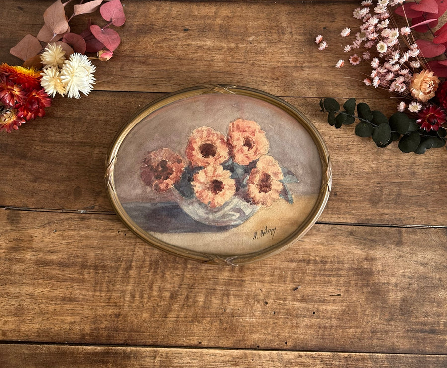 Délicate composition signée, représentant un bouquet de fleurs roses pâles orangées. Cadre ovale en bois et stuc. On aime l'atmosphère désuète qui s'en dégage. Cadre joliment imparfait. Estimation 1920.