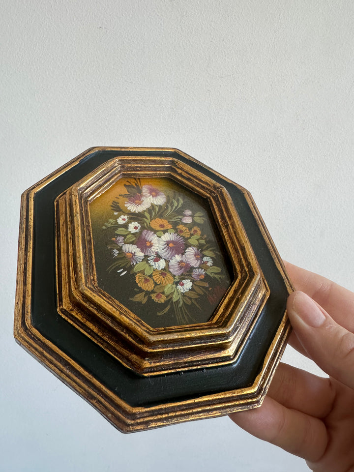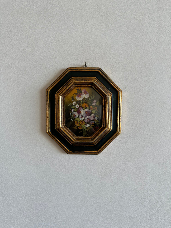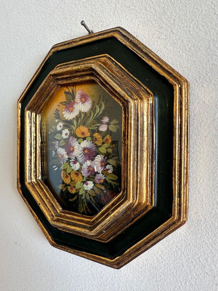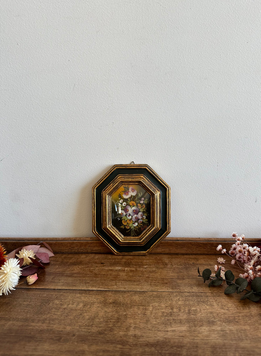 Peinture florale sous verre bombée cadre octogonale vert et or