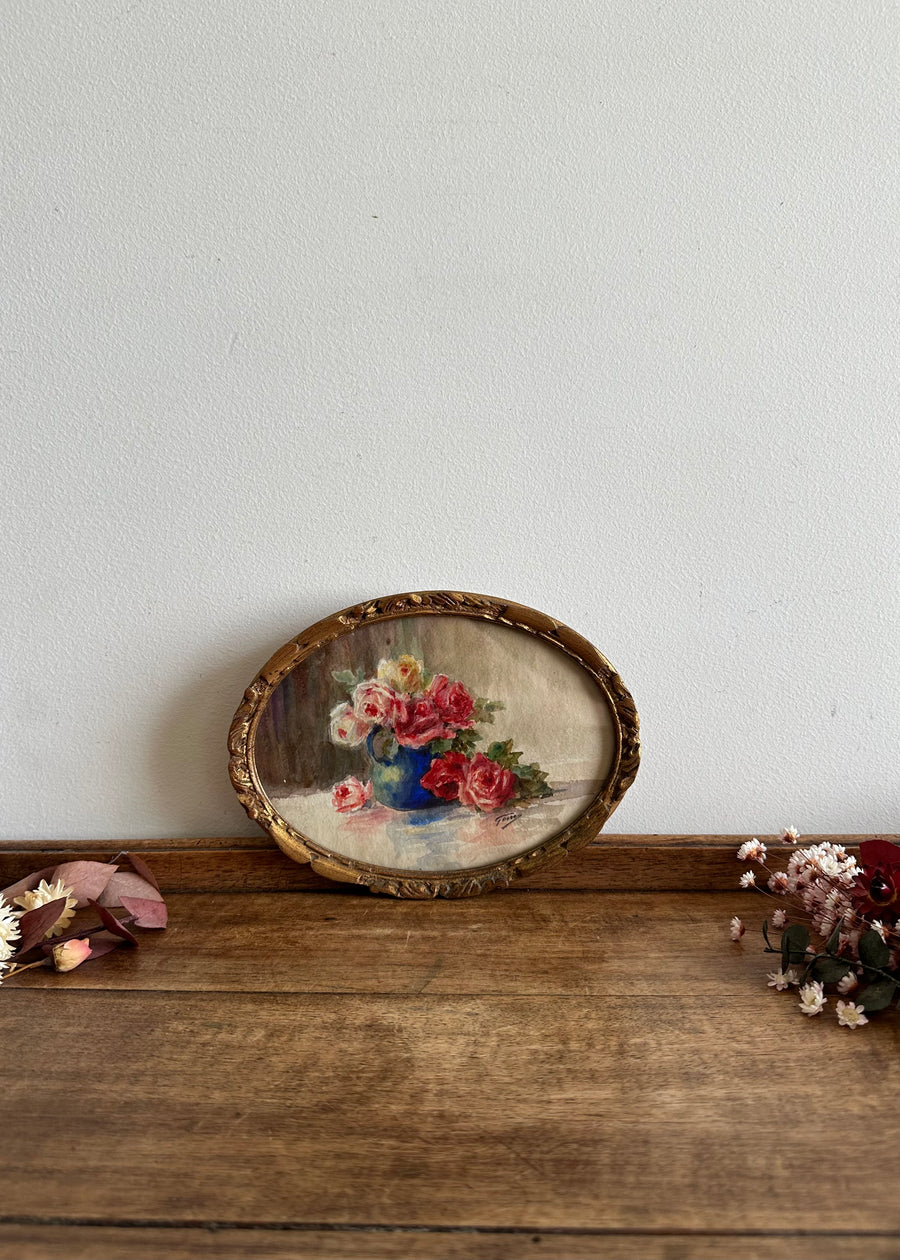 Coup de coeur pour cette charmante petite aquarelle des années 1900. Peinture signée. Cadre en bois ovale doré. One aime particulièrement la délicatesse du dessin et la richesse des couleurs.